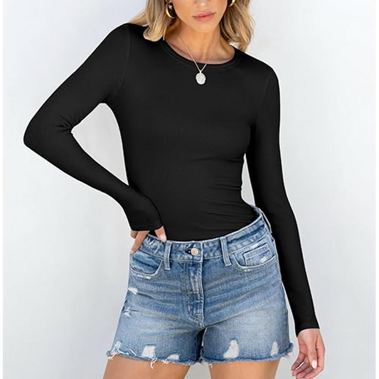 MLDRA Bodysuits for Women Long Sleeve Body Suit Crew Neck Ribbe Basic Going Out Winter Button Down Women Bodysuits Black