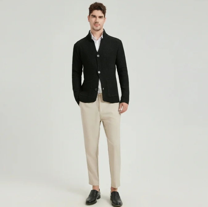 Elevate your wardrobe with this stylish Men's Knitted Button-Down Cardigan, a perfect blend of comfort and sophistication. The button-down front, along with the stand-up collar, offers versatility, making it an ideal choice for both casual and semi-formal occasions. With its tailored fit and classic design, this cardigan seamlessly transitions from a day at the office to a night out on the town.