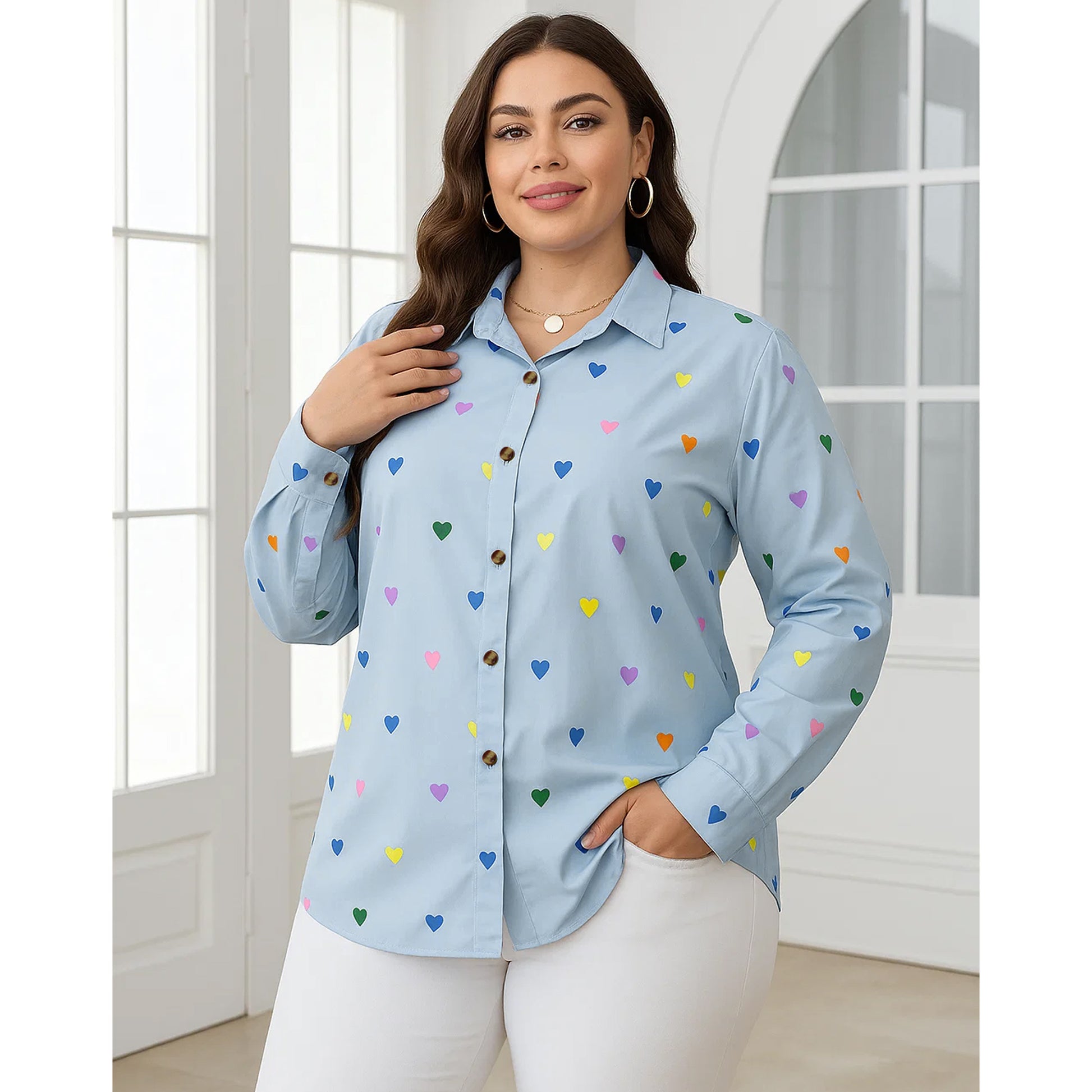 SOMER Woman Blouses Plus Size Heart Print Long Sleeve Tops Button Down Shirts Collared Neck Blue