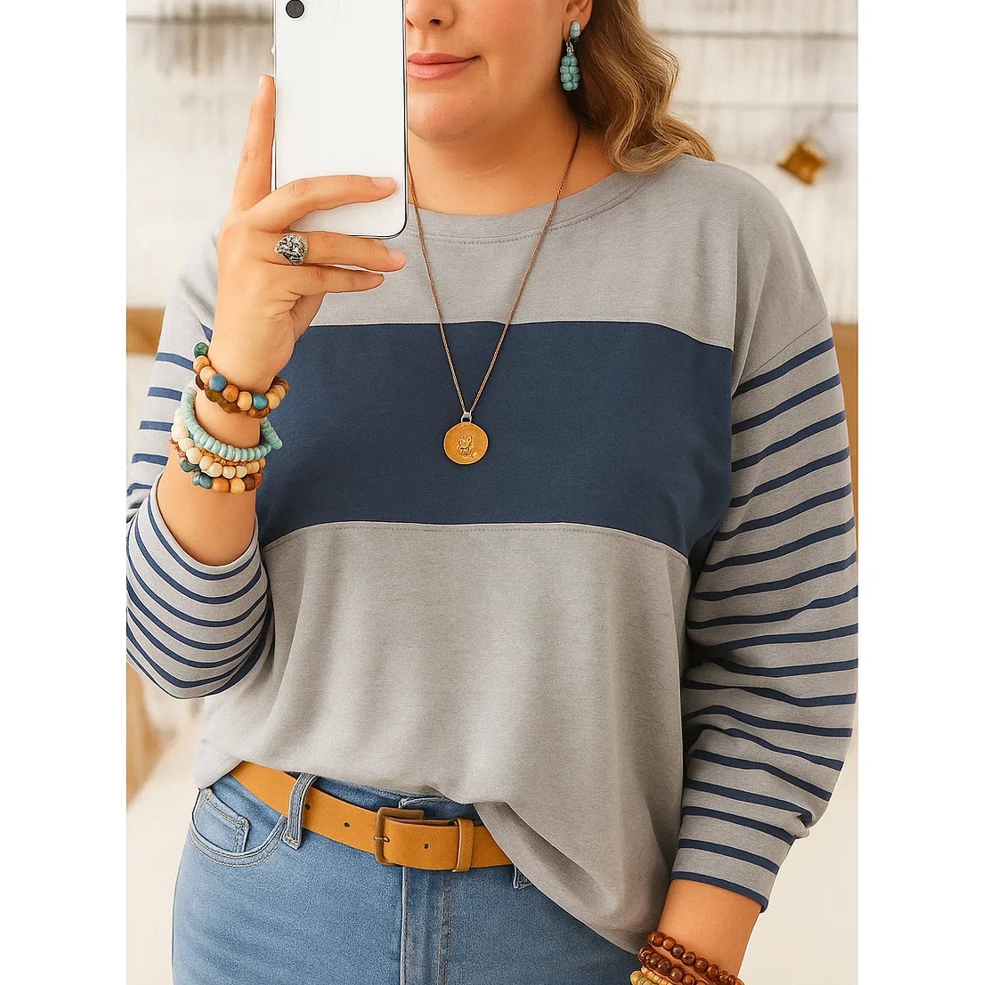 SOMER Women Blouses Plus Size Tops Long Sleeve Trendy Round Crew Neck Casual Color Block Womens Shirts Blouses